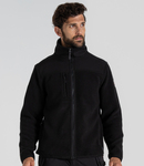 100% recycled polyester. Borg fleece with poly/elastane soft shell upper body and lower arm panels. H2OShield DWR finish to soft shell panels. Fleece lined inner collar. Full length zip with inner zip guard. Left chest zip pocket. Underarm odour control patches. Two front zip pockets. Bound elasticated cuffs and hem.