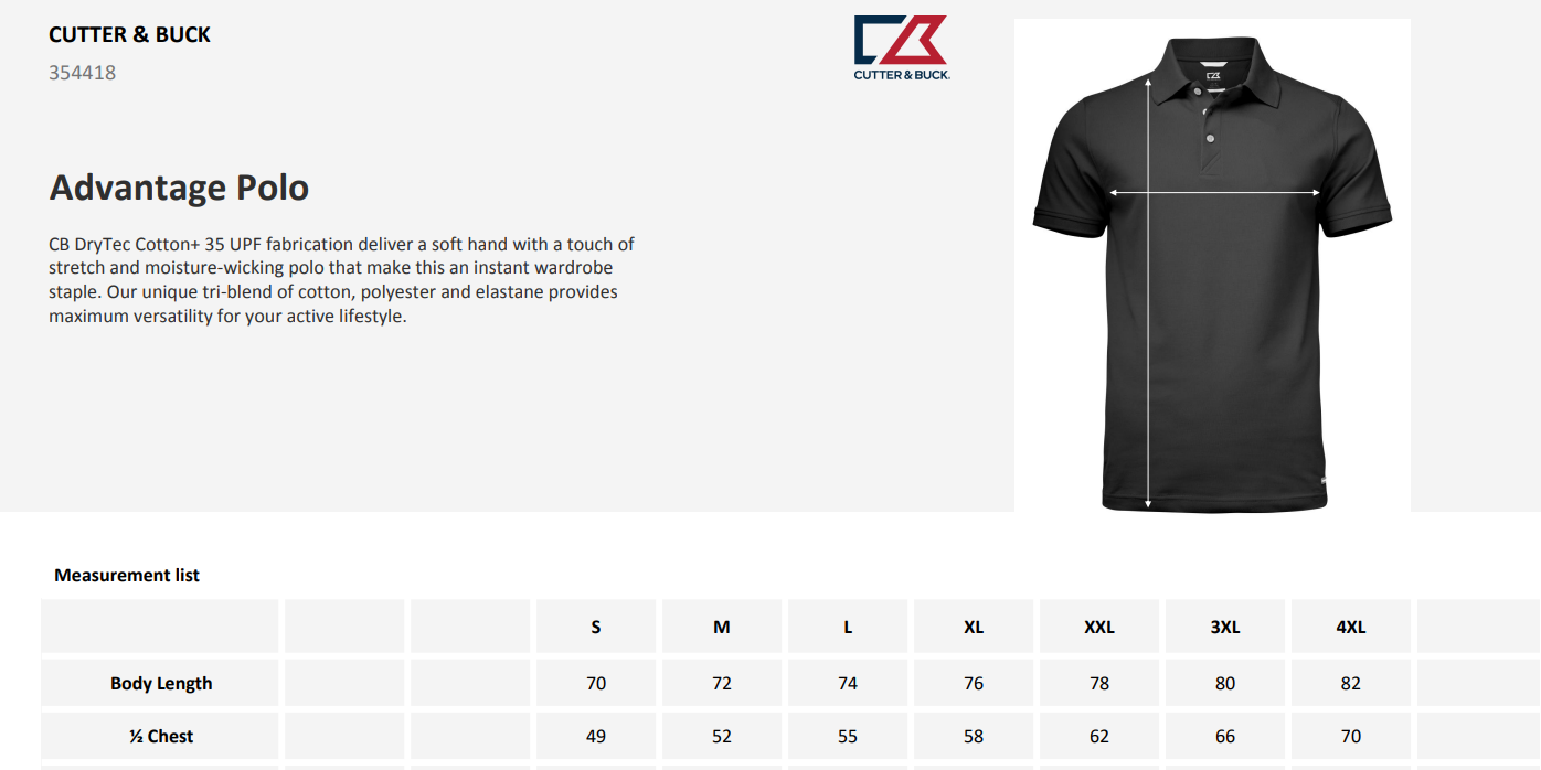 CB DryTec +35UPF fabrication delivers a soft hand with a touch of stretch and moisture-wicking style that make this an instant wardrobe staple. Our unique tri-blend quality provides maximum versatility for your active lifestyle. Advantage Premium is our updated 2.0 version with self-fabric collar and woven fabric contrasts inside to make this polo even more stylish. Metal buttons at front placket and small metal CB badge at front bottom.